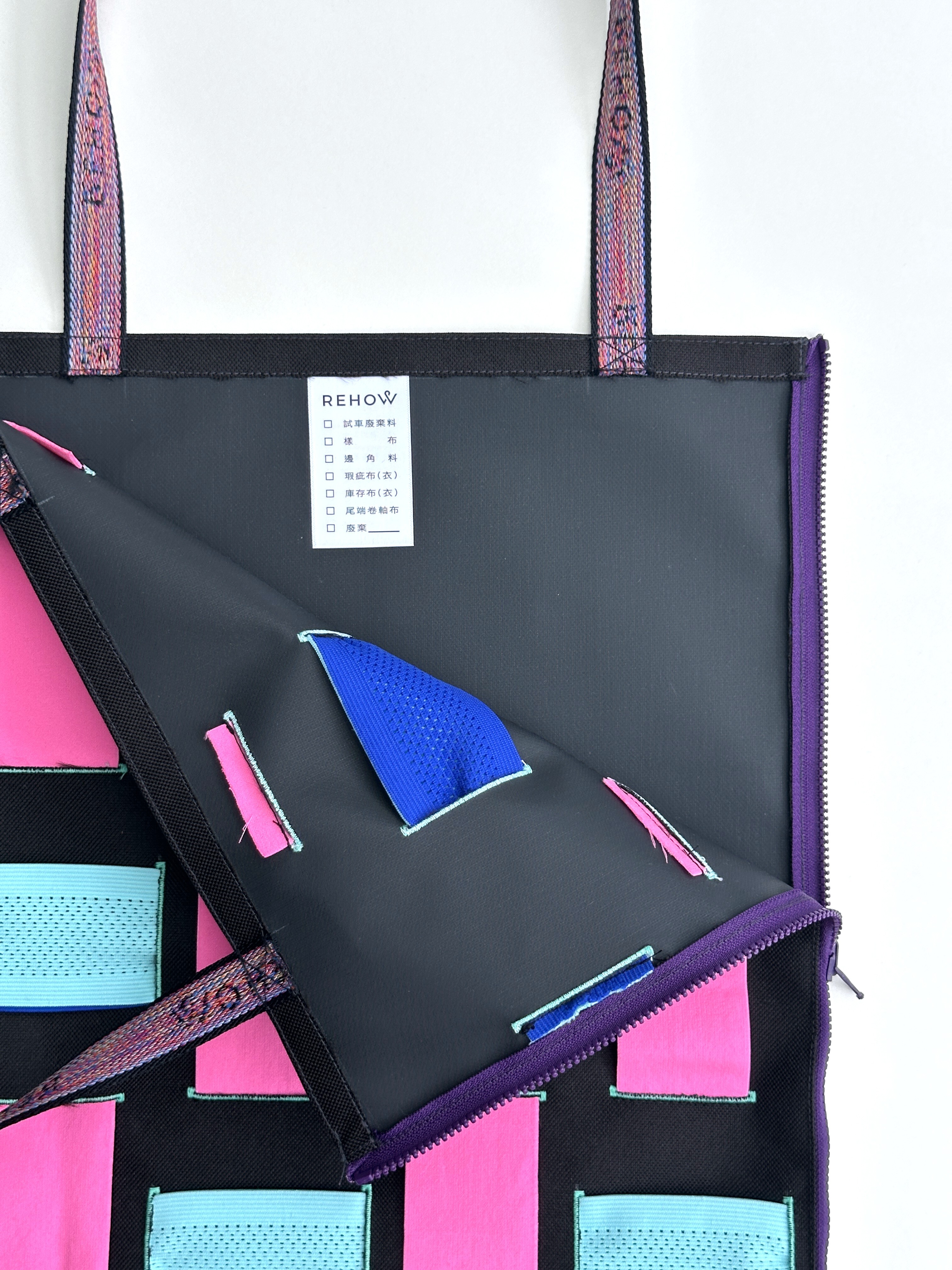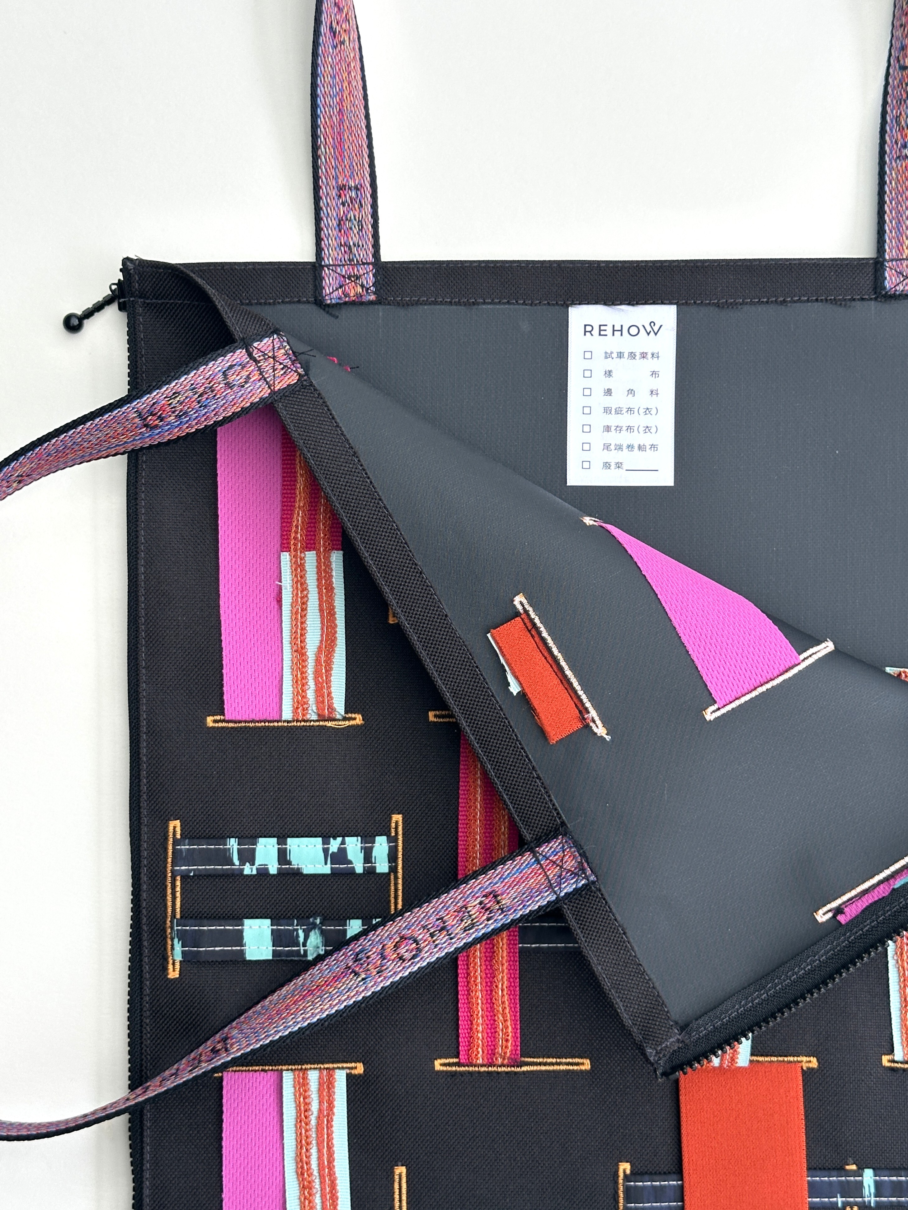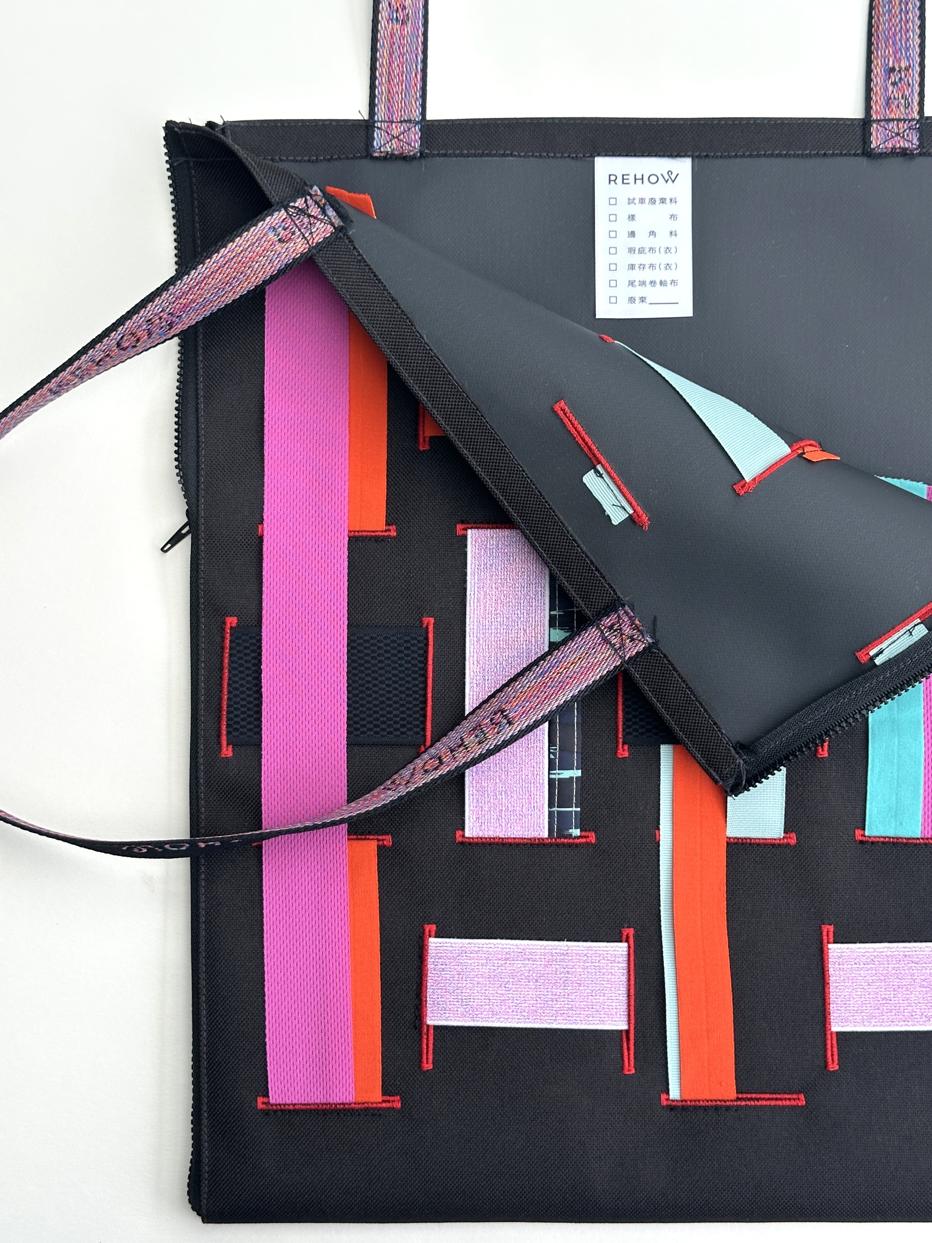 商品材質:牛津帆布 + 扣眼洞 +廢棄拉鍊 X REHOW彩色織帶